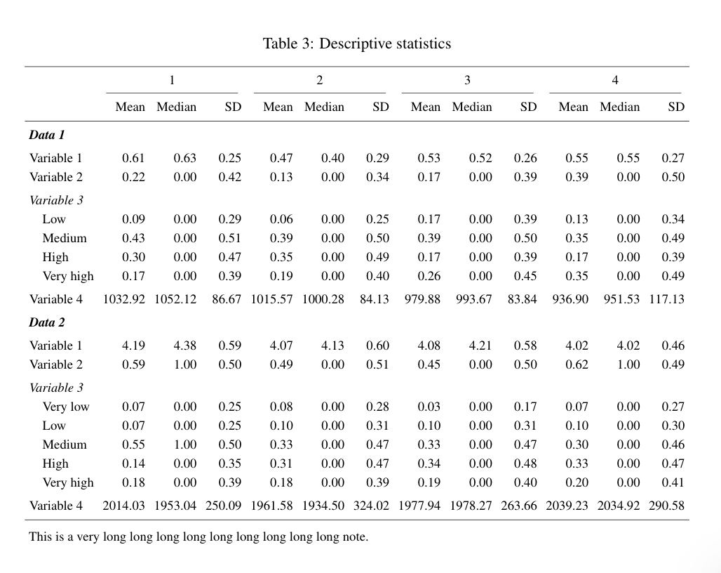 Thus, the grouping of rows is defined by the name of each dataset in the list. We can add a note, just remember to add \usepackage[flushleft]{threeparttable} to your Latex document: